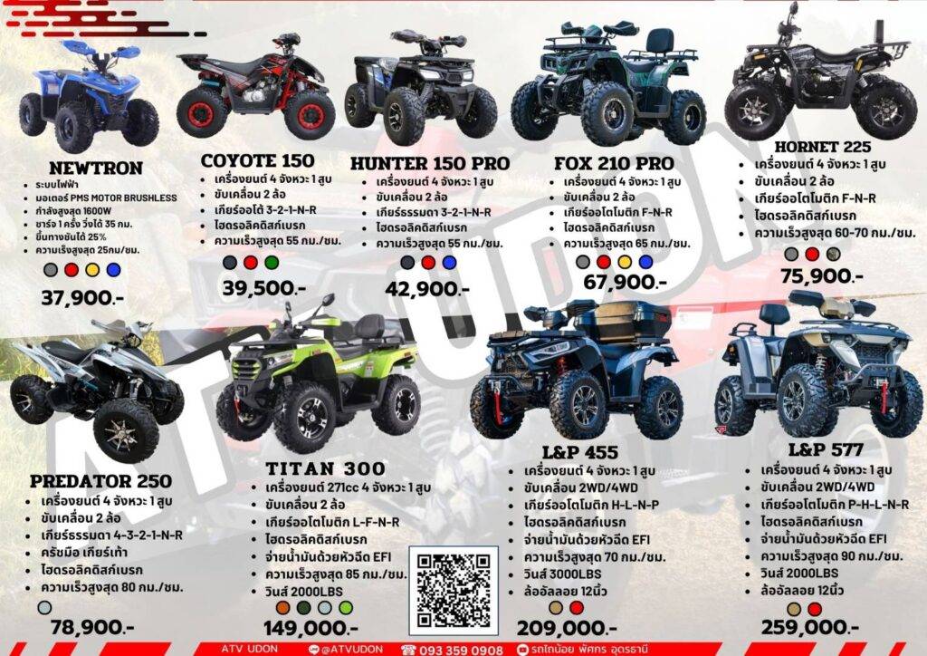 รถเอทีวี ATV CONTRA 250 PRO MAX (76,900.-) รถเอทีวี ATV HUNTER 150 PRO (42,900.-) รถเอทีวี ATV VICTOR 220 (68,900.-) รถเอทีวี ไฟฟ้า Electric ATV NEWTRON (37,900.-) รถเอทีวี ATV L&P 577 (259,000.-) รถเอทีวี ATV PREDATOR 250 (78,900.-) รถเอทีวี ATV TITAN 300 (149,000.-) รถเอทีวี ATV L&P 450 (209,000.-)